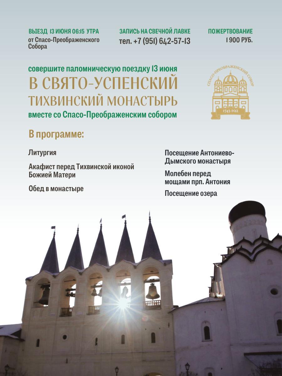 С благословения отца Николая Брындина, настоятеля Спасо-Преображенского собора, приглашаем вас в духовное путешествие к святыням Тихвинской земли. Подарите своей душе день молитвы, тишины и благодатного единения!