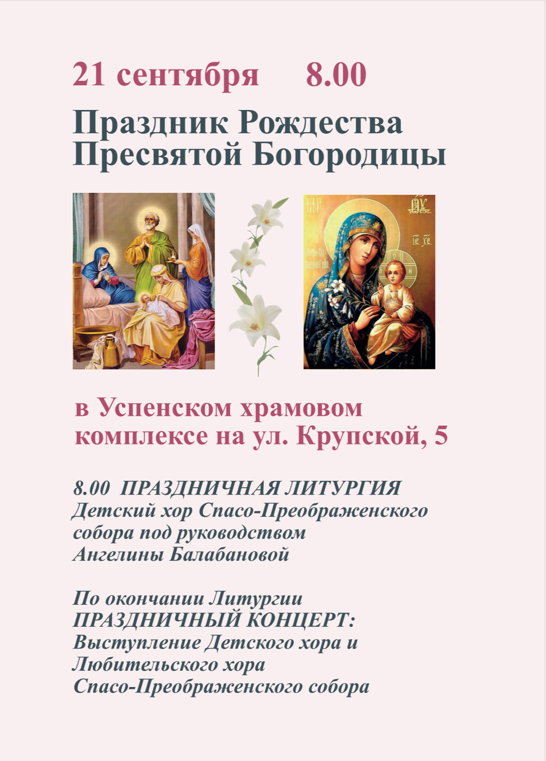 Успенский храмовой комплекс (ул. Крупской, 5) приглашает верующих разделить духовную радость этого двунадесятого праздника.